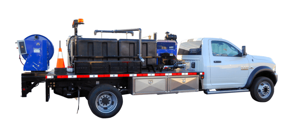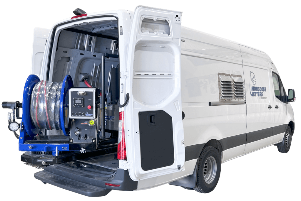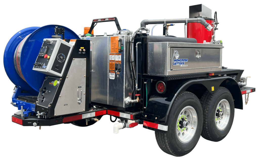 Mongoose Jetters are available in several sizes to meet different needs, ranging from 12 GPM @ 3000 PSI units to 40 GPM @ 2000 PSI, with multiple options in between. Units can be trailer-mounted, installed in vans or small trucks, or fully truck-mounted for larger systems. For example, the Model 123 trailer includes a 150–200 gallon tank, with equipment positioned for easy access while maintaining a compact footprint.